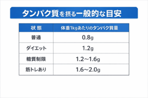 一般的に、体重1kgあたり1.2g〜1.6gの